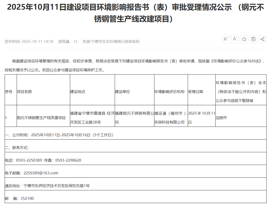2025年10月11日,寧德市生態(tài)環(huán)境局受理福建鋼元不銹鋼有限公司鋼元不銹鋼管生產(chǎn)線改建項目環(huán)境影響評價報告表并對外進(jìn)行公示,公示時間:2025年10月11日-2025年10月16日(5個工作日)。