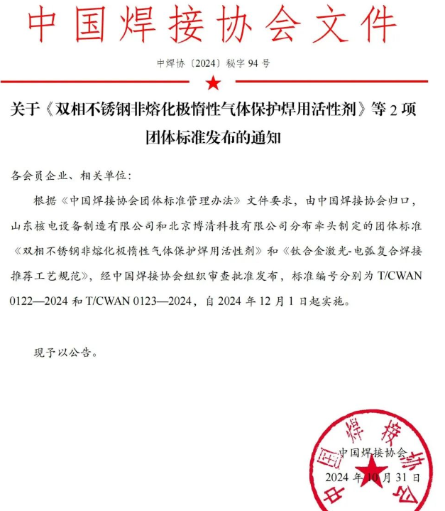2024年10月31日,據(jù)中國焊接協(xié)會關(guān)于雙相不銹鋼非熔化極惰性氣體保護(hù)焊用活性劑》等2項團(tuán)體標(biāo)準(zhǔn)發(fā)布通知稱,由中國焊接協(xié)會歸口山東核電設(shè)備制造有限公司牽頭制定的團(tuán)體標(biāo)準(zhǔn)《雙相不銹鋼非熔化極惰性氣體保護(hù)焊用活性劑》標(biāo)準(zhǔn)編號為T/CWAN0122-2024,該標(biāo)準(zhǔn)將于2024年12月1日起實施。