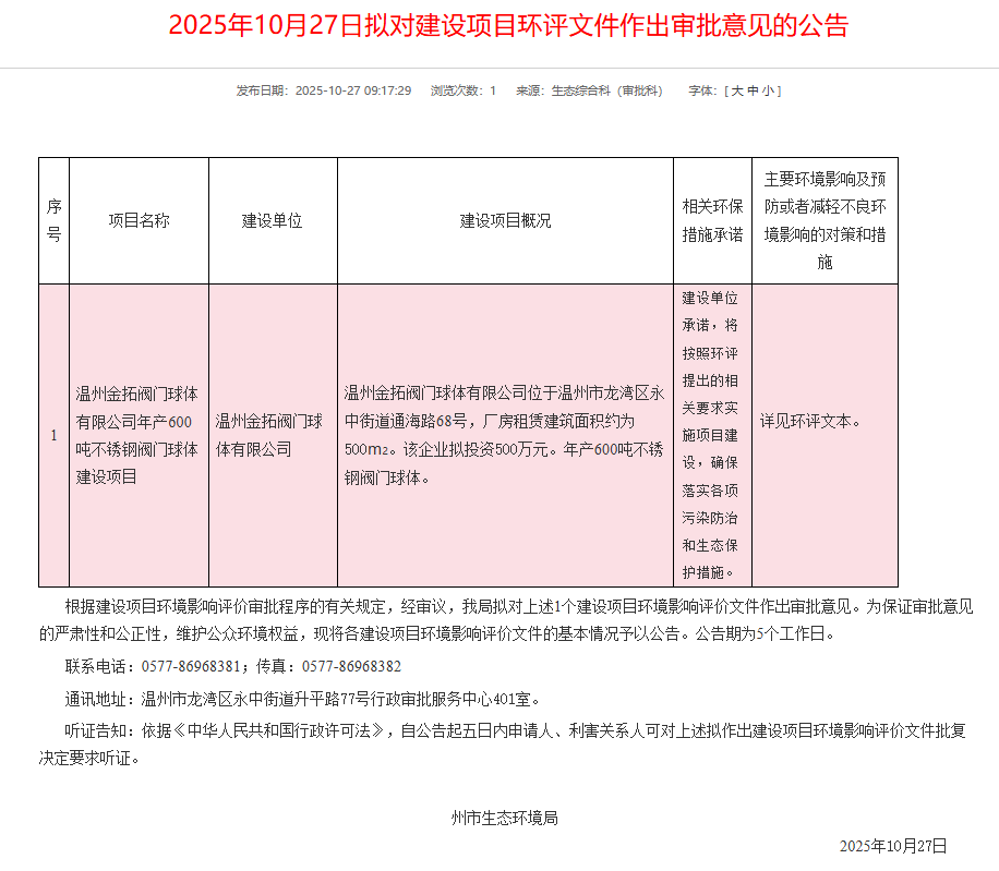 2025年10月27日,溫州市生態(tài)環(huán)境局就溫州金拓閥門球體有限公司年產(chǎn)600噸不銹鋼閥門球體建設(shè)項(xiàng)目環(huán)境影響報(bào)告表作出審批意見并對(duì)外進(jìn)行公告,公告期:5個(gè)工作日。
