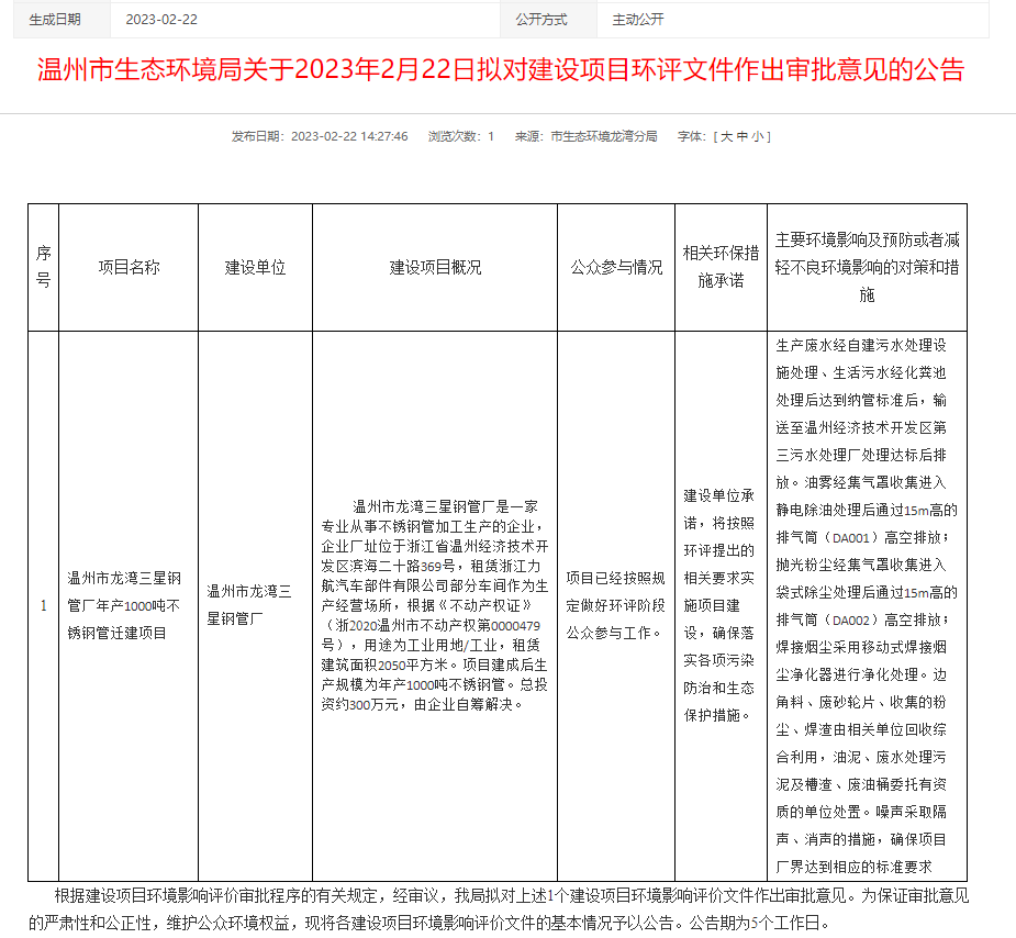 2月21日,溫州市生態環境局龍灣分局就溫州市龍灣三星鋼管廠年產1000噸不銹鋼管遷建項目環境影響評價報告表作出審批意見并對外進行公告,公告期:5個工作日。